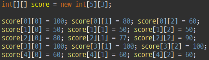 int[][] score = {{100, 80, 60}, {50, 50, 50}, {80, 77, 90}, {100, 100, 100}, {60, 60, 60}};