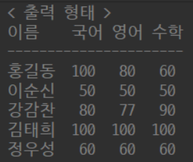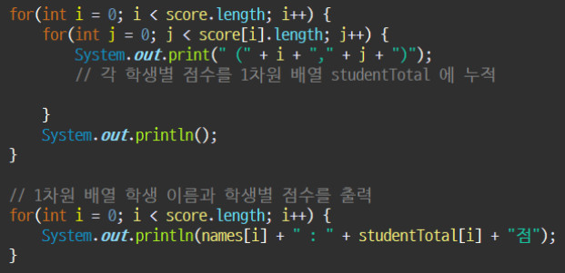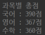 System.out.println(names[i] + " : " + studentTotal[i] + "점");
